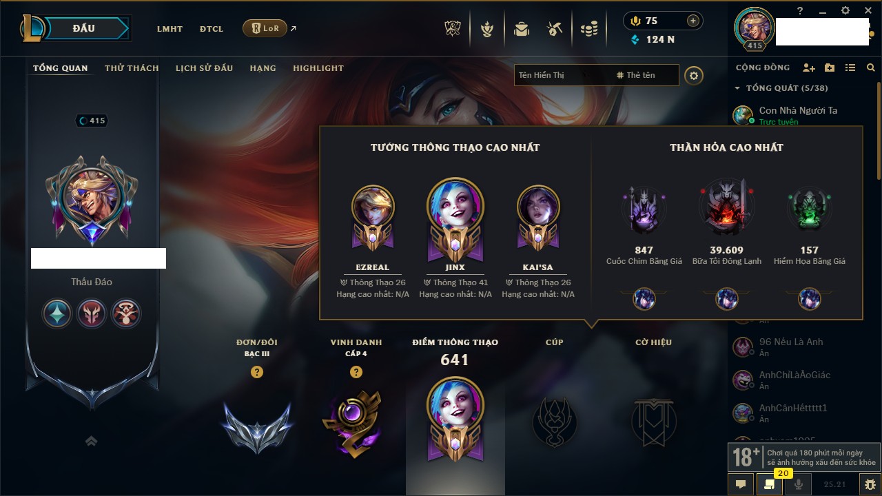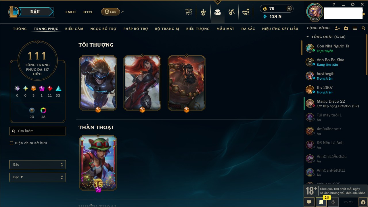 Rank Đơn: Vàng IIKhung: VàngTướng: 171 - Còn 219803 THXTrang Phục: 254Rank ĐTCL: Chưa RankLinh Thú: 78