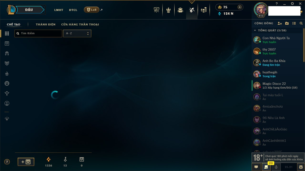 Rank Đơn: Bạch Kim IVKhung: VàngTướng: 171 - Còn 130280 THXTrang Phục: 226Rank ĐTCL: Kim Cương IVLinh Thú: 183