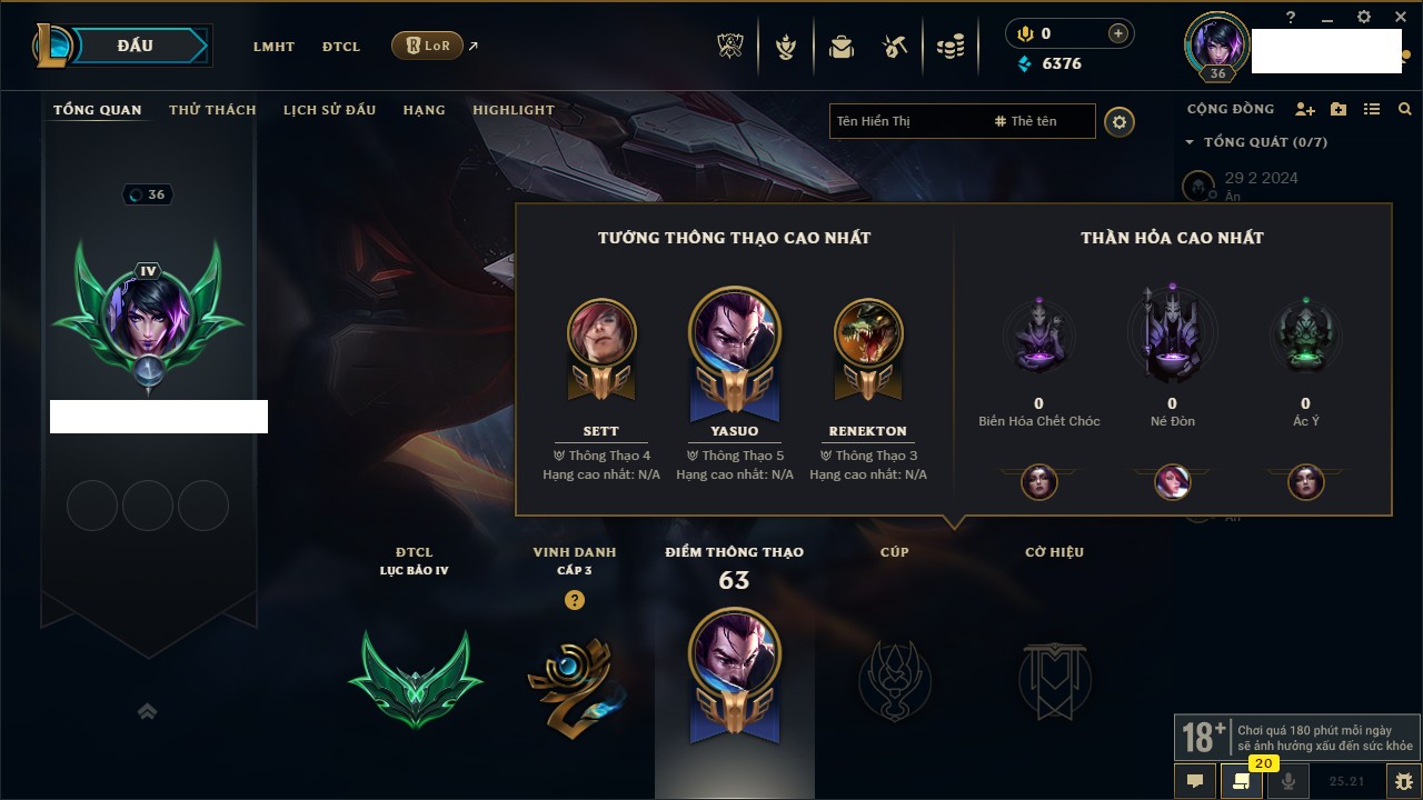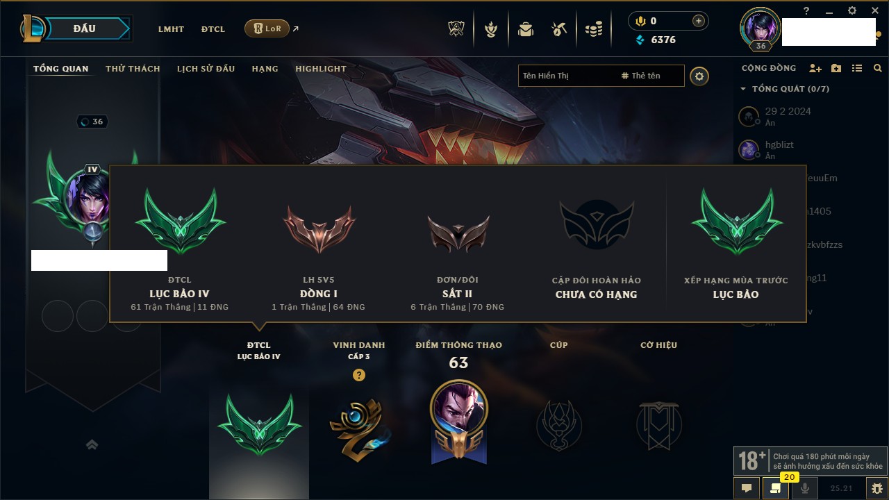 Rank Đơn: Lục Bảo IVKhung: VàngTướng: 171 - Còn 154648 THXTrang Phục: 203Rank ĐTCL: Bạch Kim IVLinh Thú: 69
