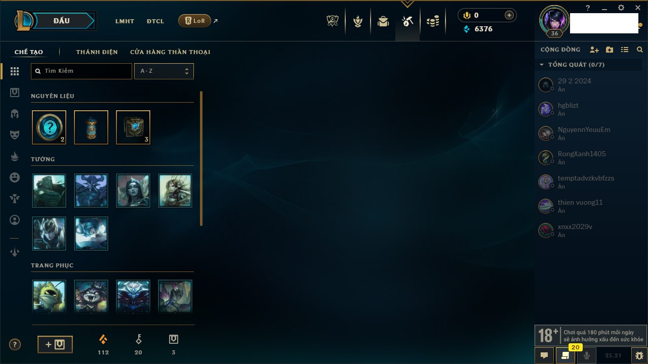 Rank Đơn: Bạc IIIKhung: BạcTướng: 171 - Còn 190352 THXTrang Phục: 260Rank ĐTCL: Sắt IILinh Thú: 31