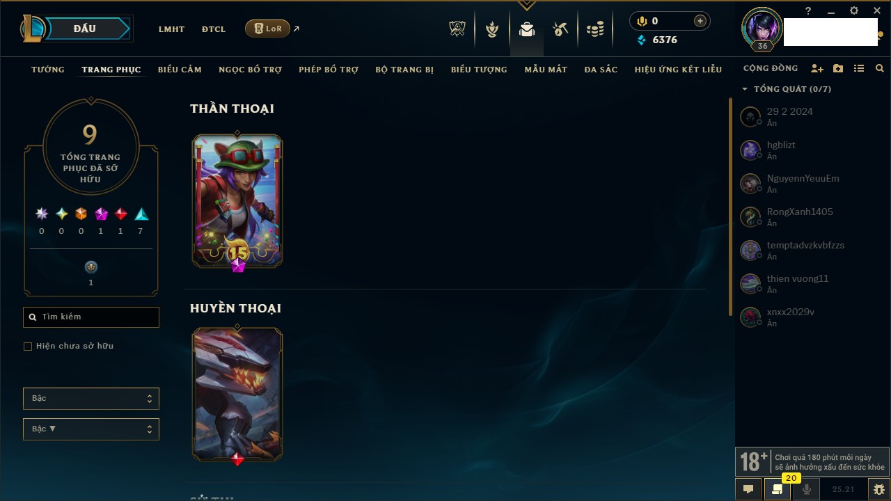 Rank Đơn: Vàng IIKhung: VàngTướng: 170 - Còn 243330 THXTrang Phục: 230Rank ĐTCL: Chưa RankLinh Thú: 68