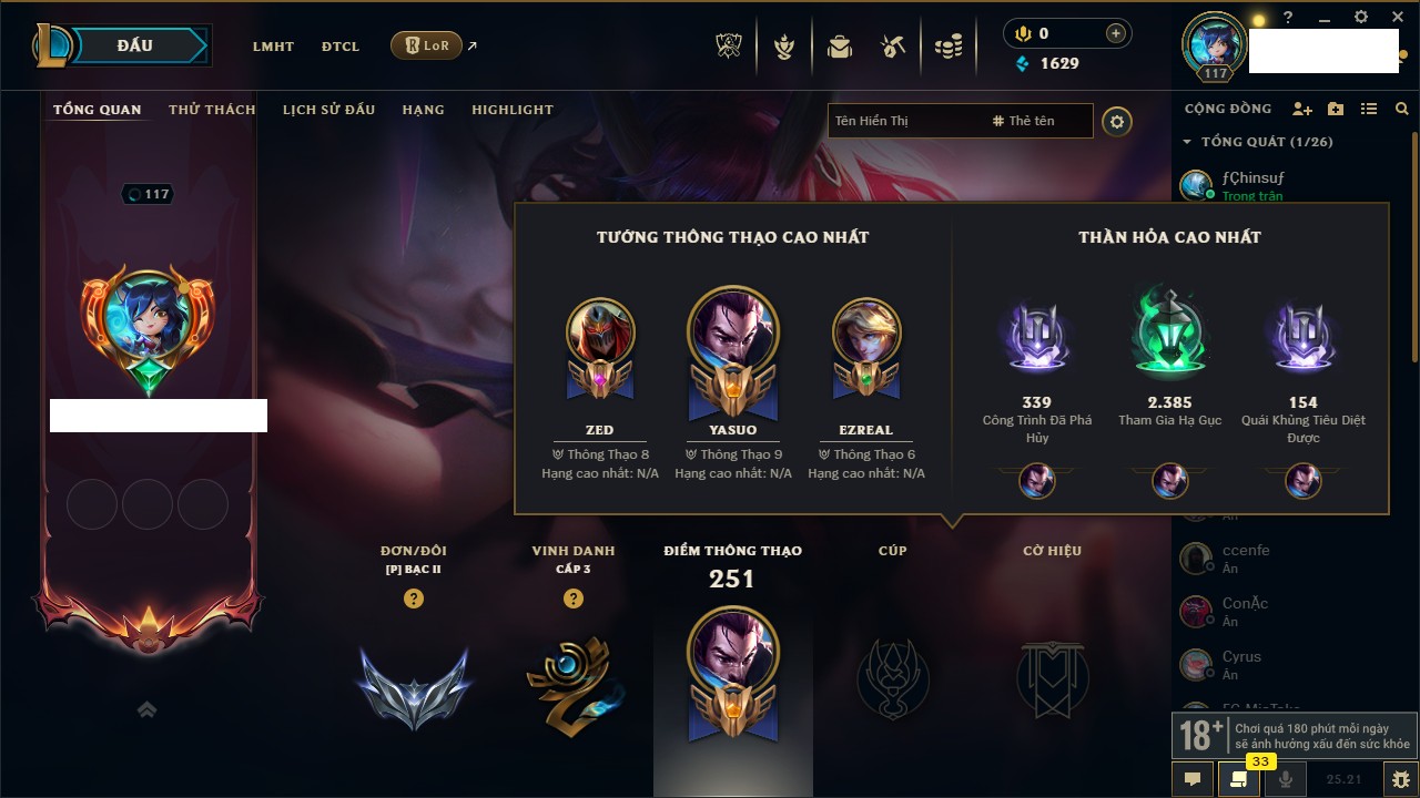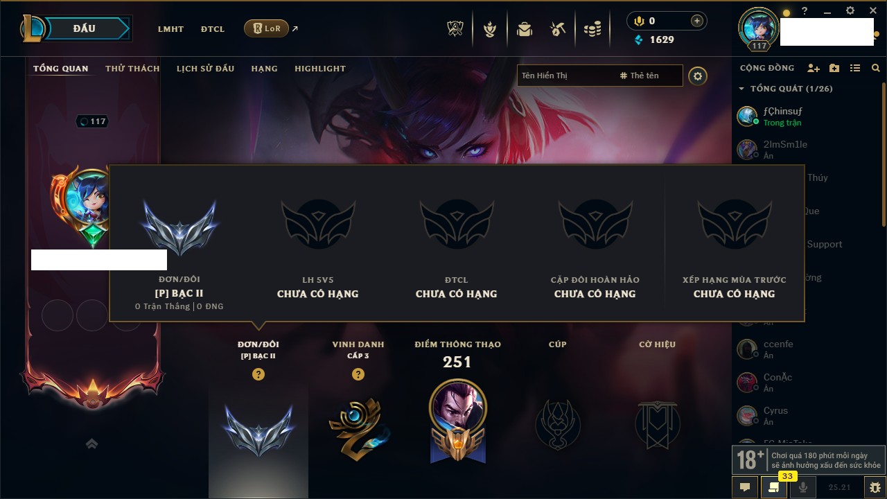 Rank Đơn: Bạc II Khung: Chưa có khung Tướng: 78 - Còn 1629 THX Trang Phục: 31 Rank ĐTCL: Chưa Rank Linh Thú: 51