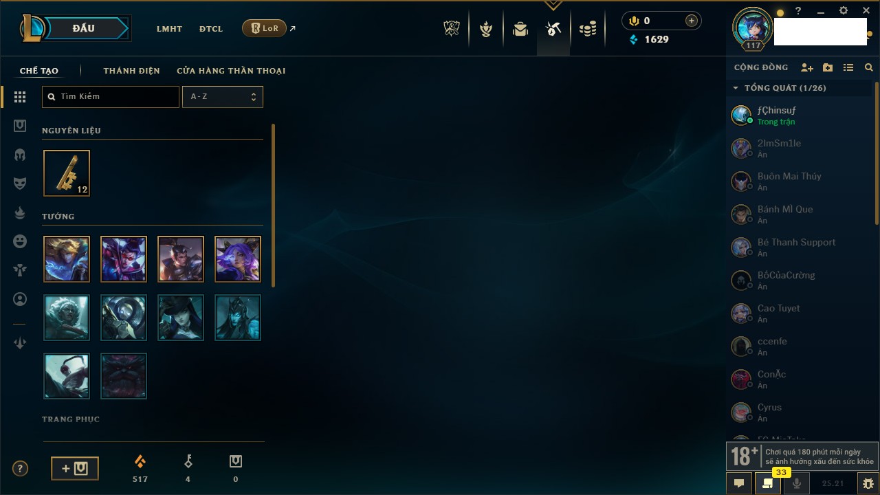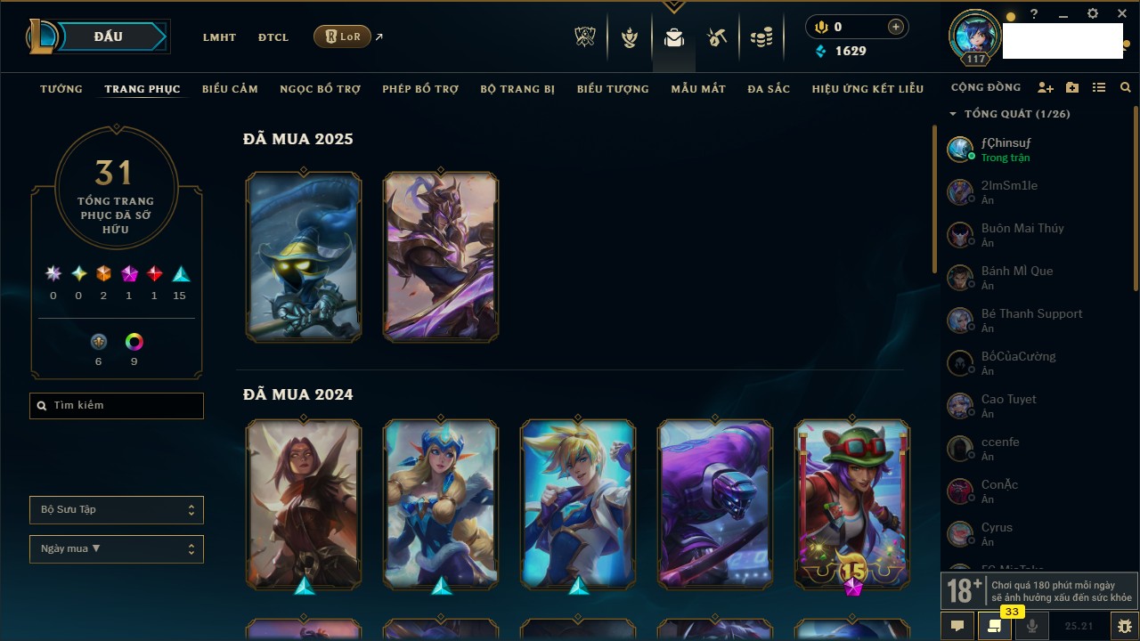 Rank Đơn: Chưa rank mùa nào Khung: Chưa có khung Tướng: 166 - Còn 3090 THX Trang Phục: 9 Rank ĐTCL: Chưa Rank Linh Thú: 125