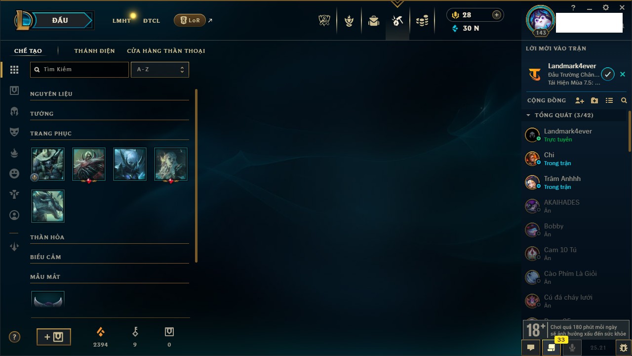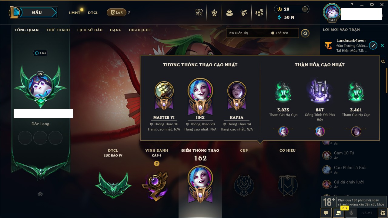 Rank Đơn: Chưa RankKhung: Chưa có khungTướng: 143 - Còn 595 THXTrang Phục: 114Rank ĐTCL: Chưa RankLinh Thú: 65