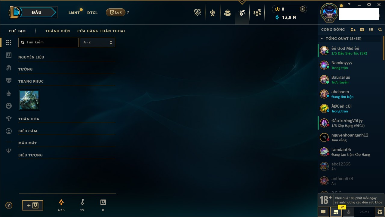 Rank Đơn: Vàng IIIKhung: VàngTướng: 77 - Còn 21172 THXTrang Phục: 8Rank ĐTCL: Kim Cương IIILinh Thú: 23