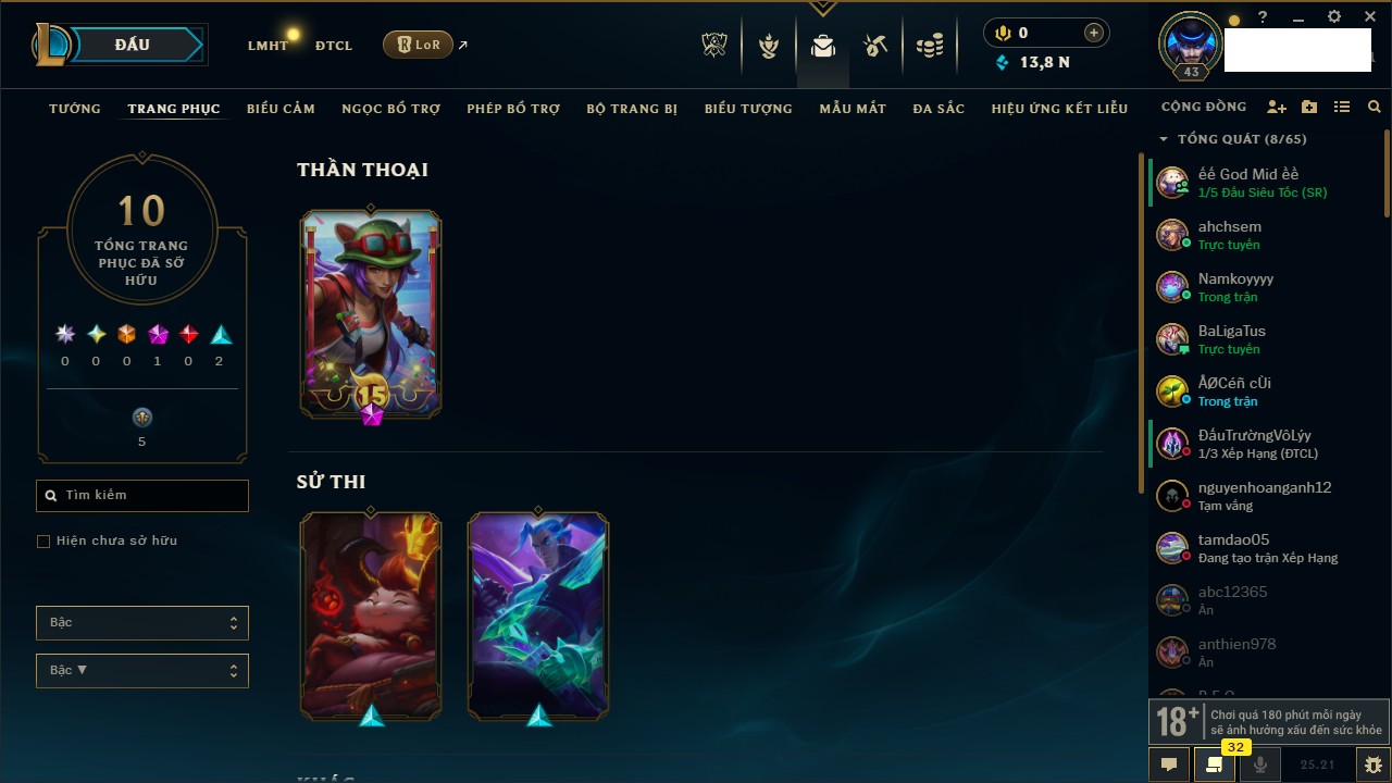 Rank Đơn: Sắt IIIKhung: Chưa có khungTướng: 77 - Còn 8133 THXTrang Phục: 11Rank ĐTCL: Bạch Kim IVLinh Thú: 108