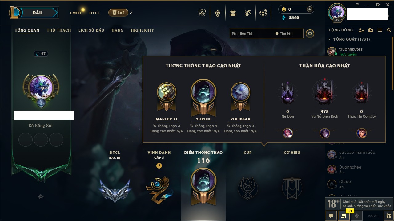 Rank Đơn: Chưa Rank Khung: Đồng Tướng: 171 - Còn 82665 THX Trang Phục: 45 Rank ĐTCL: Chưa Rank Linh Thú: 95