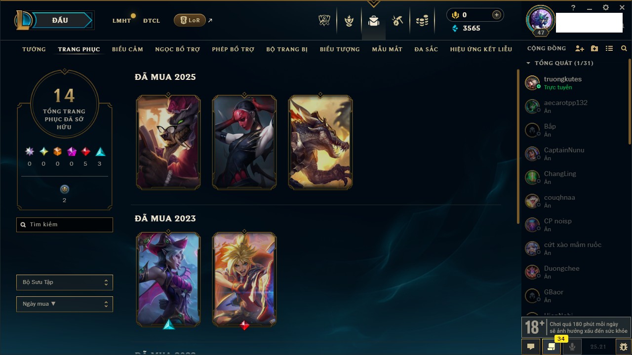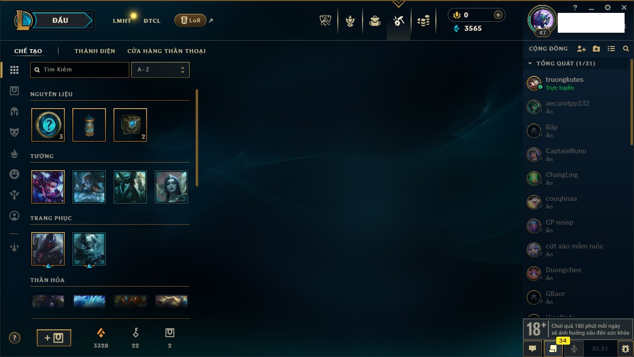 Rank Đơn: Chưa Rank Khung: Chưa có khung Tướng: 171 - Còn 52162 THX Trang Phục: 78 Rank ĐTCL: Chưa Rank Linh Thú: 145