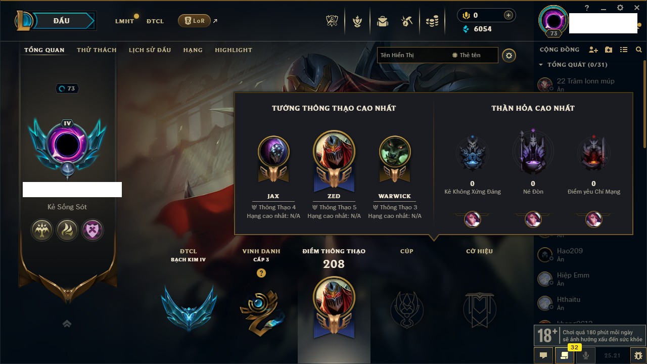 Rank Đơn: Bạc IIIKhung: Chưa có khungTướng: 163 - Còn 66843 THXTrang Phục: 182Rank ĐTCL: Kim Cương IVLinh Thú: 114