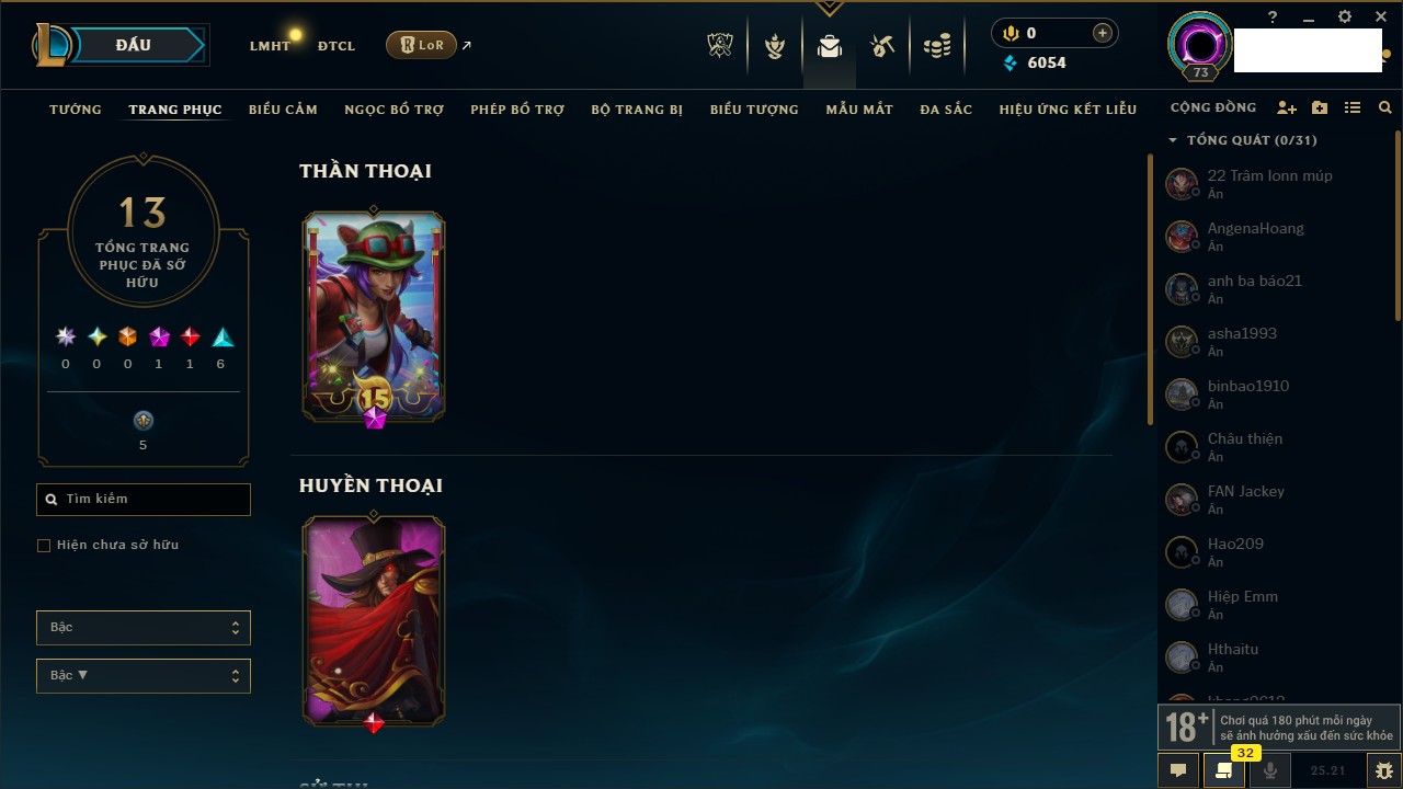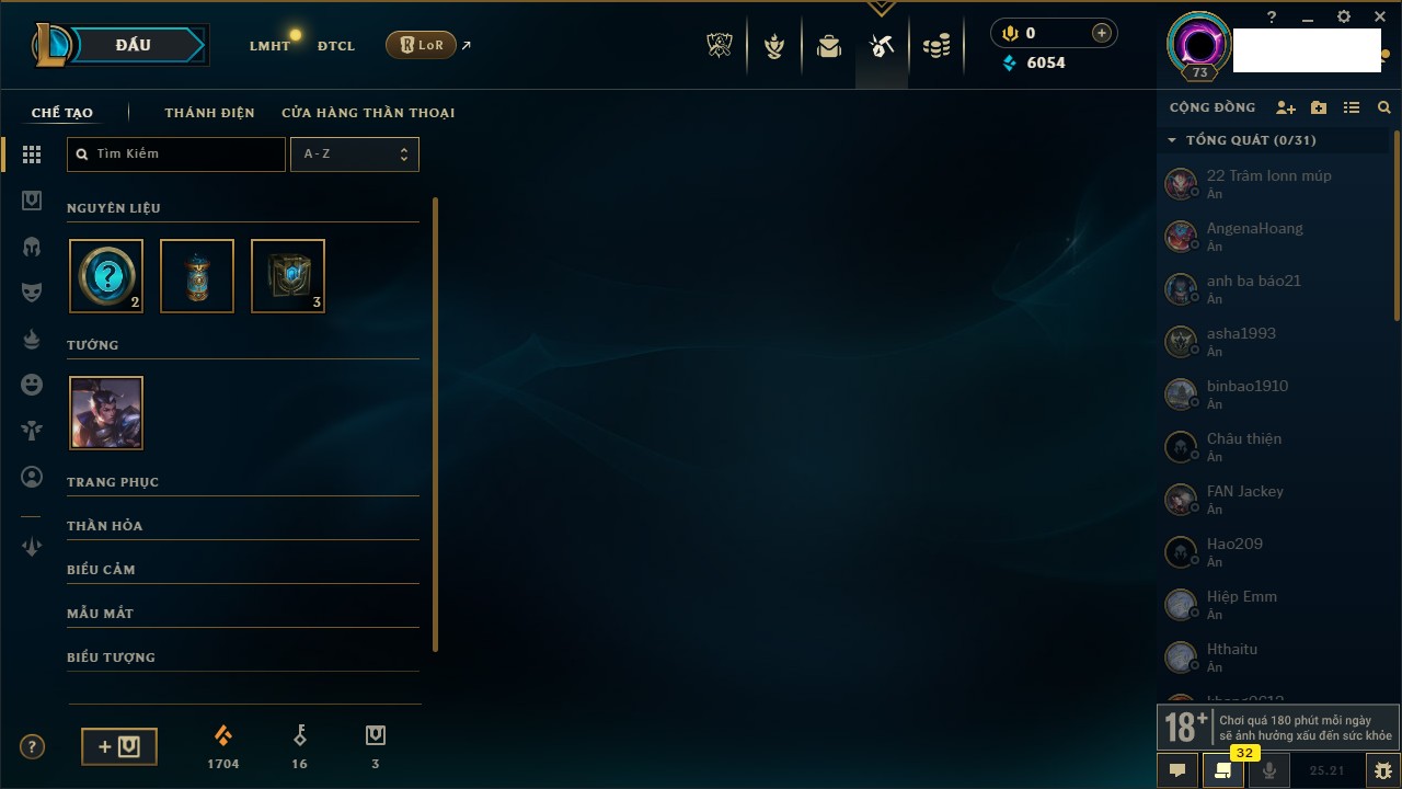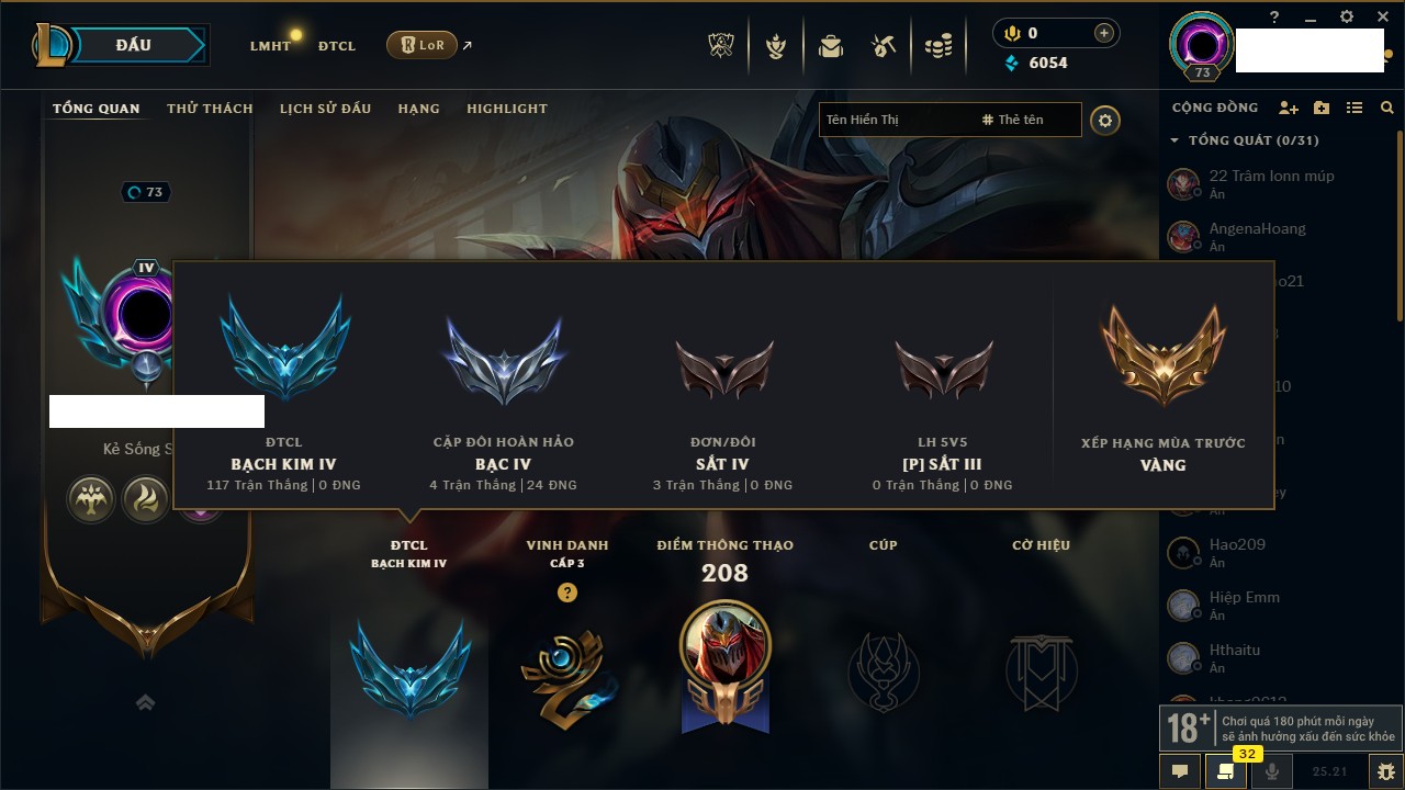 Rank Đơn: Vàng IIIKhung: BạcTướng: 171 - Còn 101359 THXTrang Phục: 88Rank ĐTCL: Kim Cương IVLinh Thú: 200