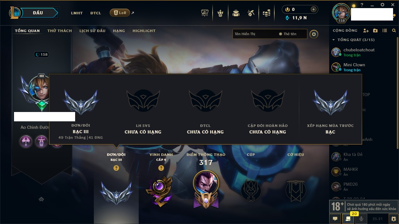 Rank Đơn: Bạc IIIKhung: Chưa có khungTướng: 163 - Còn 66843 THXTrang Phục: 182Rank ĐTCL: Kim Cương IVLinh Thú: 114