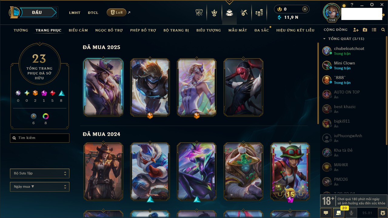Rank Đơn: Vàng IIIKhung: BạcTướng: 171 - Còn 101359 THXTrang Phục: 88Rank ĐTCL: Kim Cương IVLinh Thú: 200