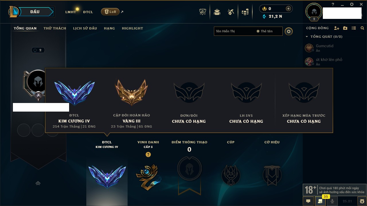Rank Đơn: Chưa rank mùa nàoKhung: Chưa có khungTướng: 1 - Còn 9000 THXTrang Phục: 0Rank ĐTCL: Bạch Kim IIILinh Thú: 14
