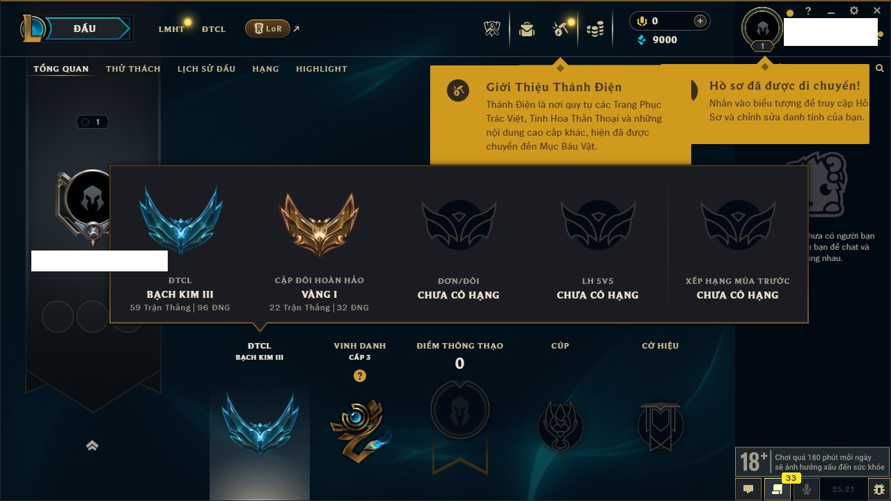 Rank Đơn: Chưa RankKhung: Chưa có khungTướng: 118 - Còn 13712 THXTrang Phục: 117Rank ĐTCL: Chưa RankLinh Thú: 34