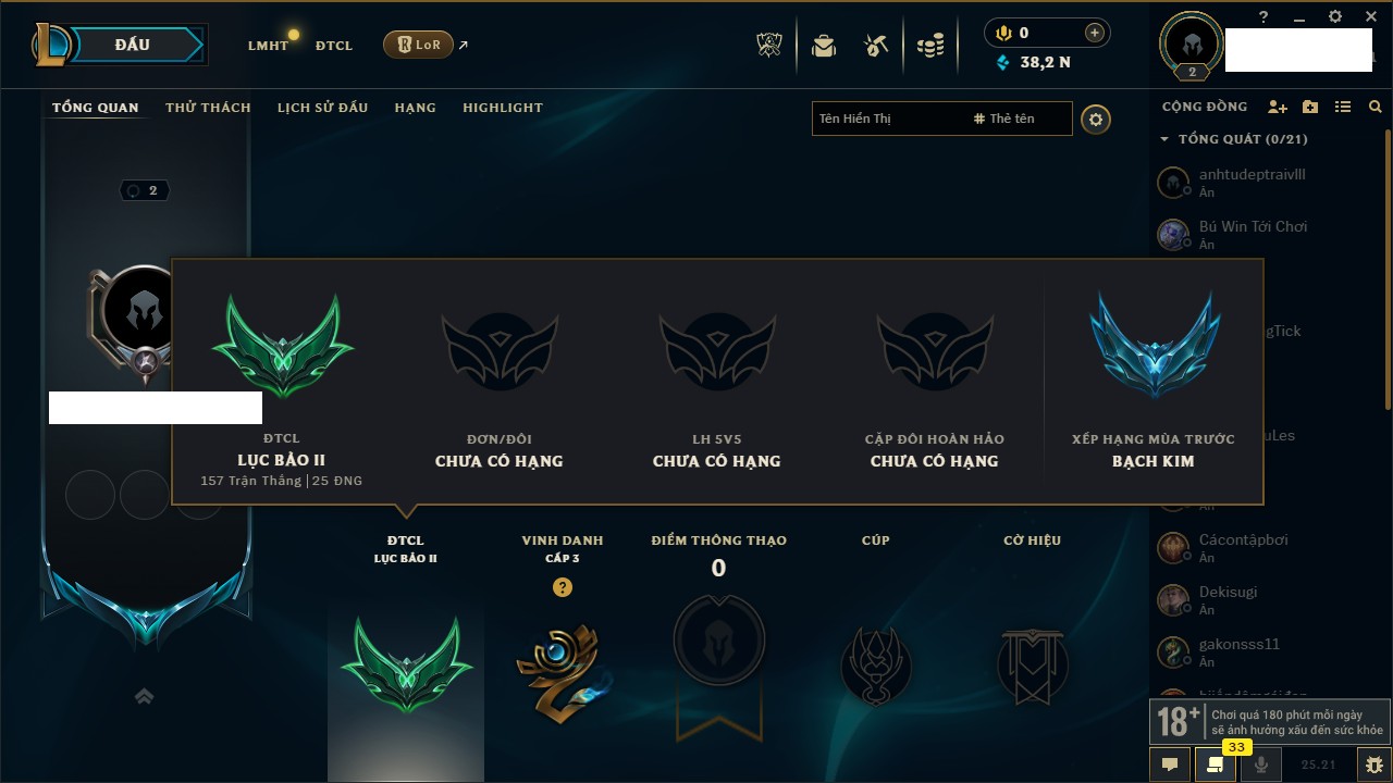 Rank Đơn: Chưa rank mùa nàoKhung: Chưa có khungTướng: 1 - Còn 9000 THXTrang Phục: 0Rank ĐTCL: Bạch Kim IIILinh Thú: 14