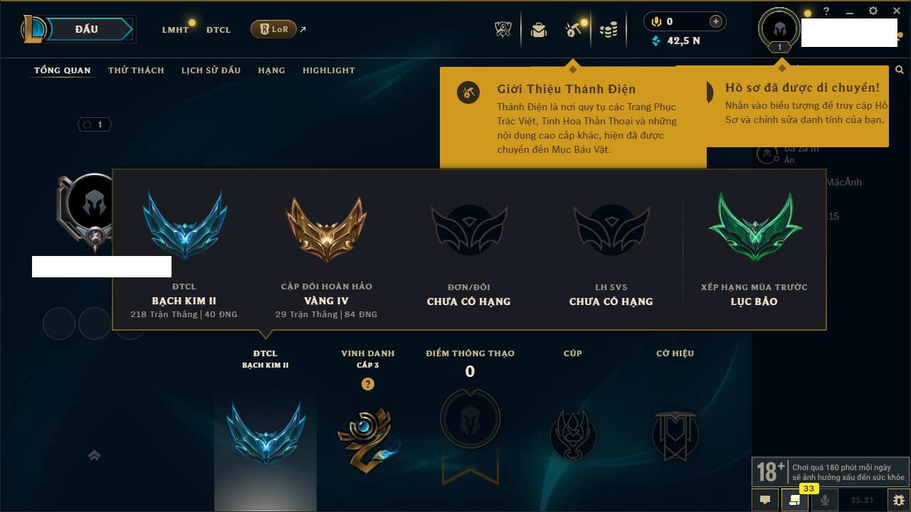 Rank Đơn: Chưa rank mùa nàoKhung: Chưa có khungTướng: 2 - Còn 9000 THXTrang Phục: 0Rank ĐTCL: Bạch Kim IIILinh Thú: 31