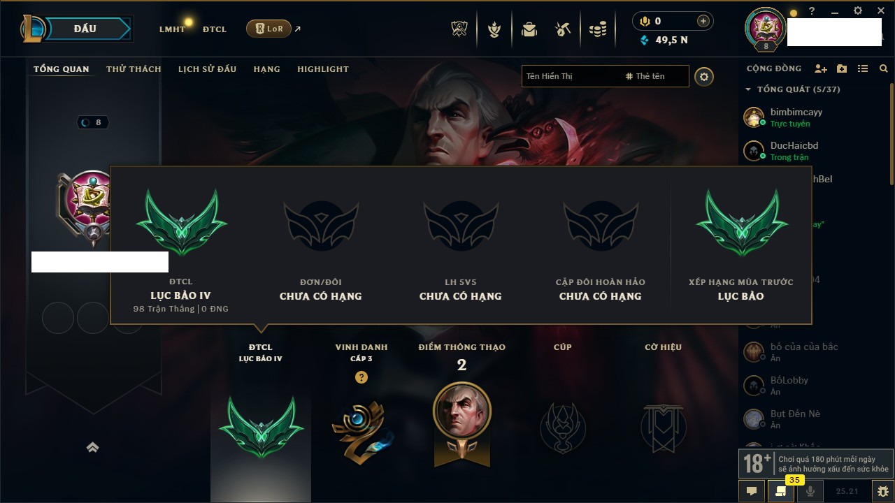 Rank Đơn: Lục Bảo IVKhung: Bạch kimTướng: 171 - Còn 128452 THXTrang Phục: 193Rank ĐTCL: Bạc IIILinh Thú: 100