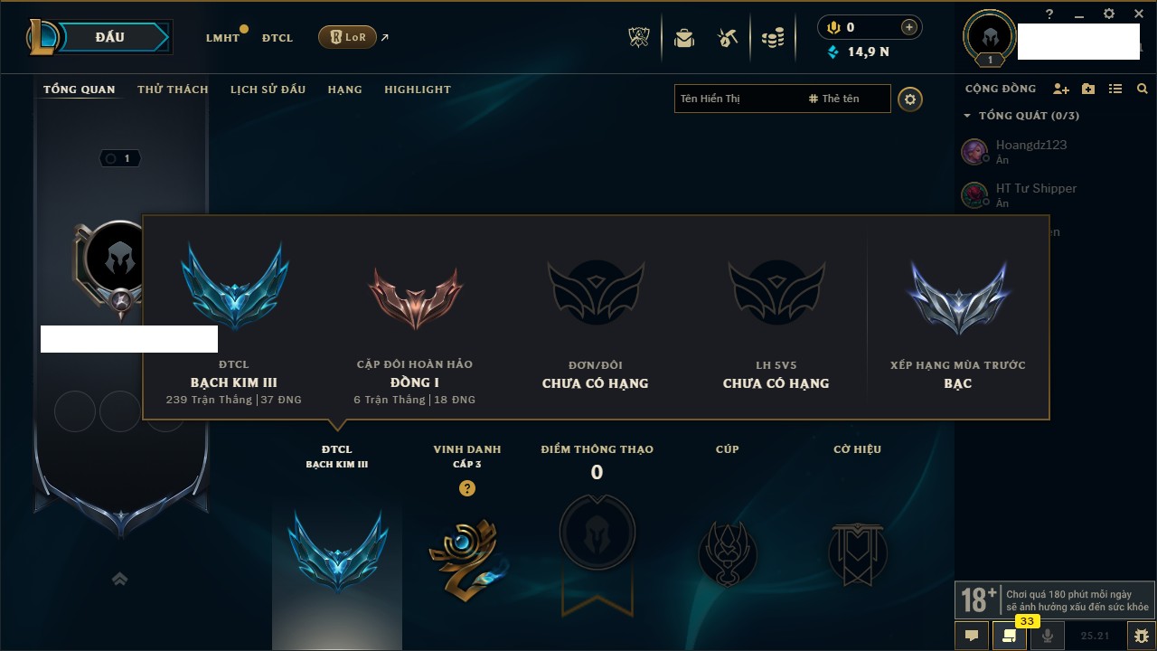 Rank Đơn: Chưa rank mùa nàoKhung: Chưa có khungTướng: 2 - Còn 14900 THXTrang Phục: 0Rank ĐTCL: Bạch Kim IIILinh Thú: 29