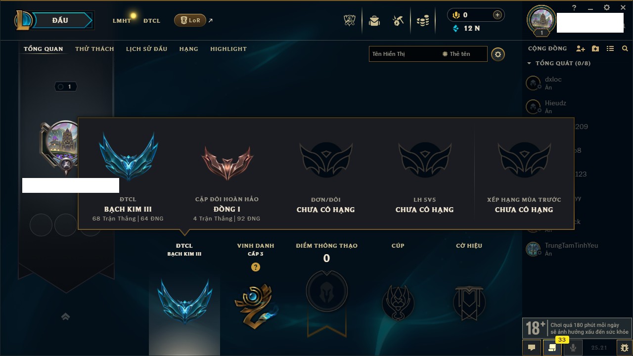 Rank Đơn: Chưa rank mùa nàoKhung: Chưa có khungTướng: 4 - Còn 12000 THXTrang Phục: 0Rank ĐTCL: Bạch Kim IIILinh Thú: 20