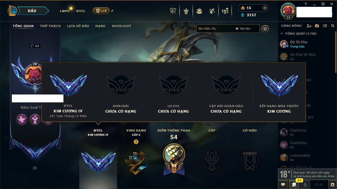 Rank Đơn: Chưa RankKhung: Chưa có khungTướng: 118 - Còn 13712 THXTrang Phục: 117Rank ĐTCL: Chưa RankLinh Thú: 34