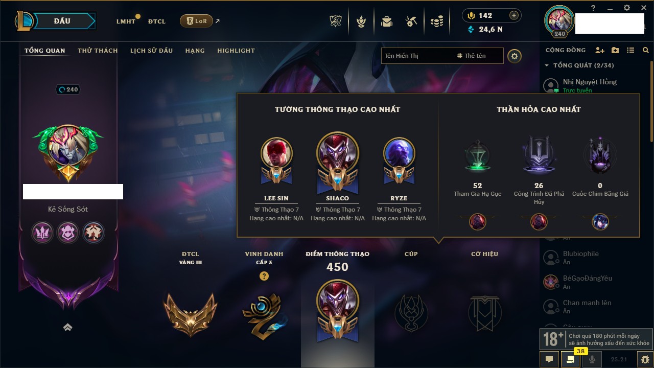 Rank Đơn: Bạch Kim IIKhung: Bạch kimTướng: 171 - Còn 316137 THXTrang Phục: 89Rank ĐTCL: Bạch Kim IIILinh Thú: 94