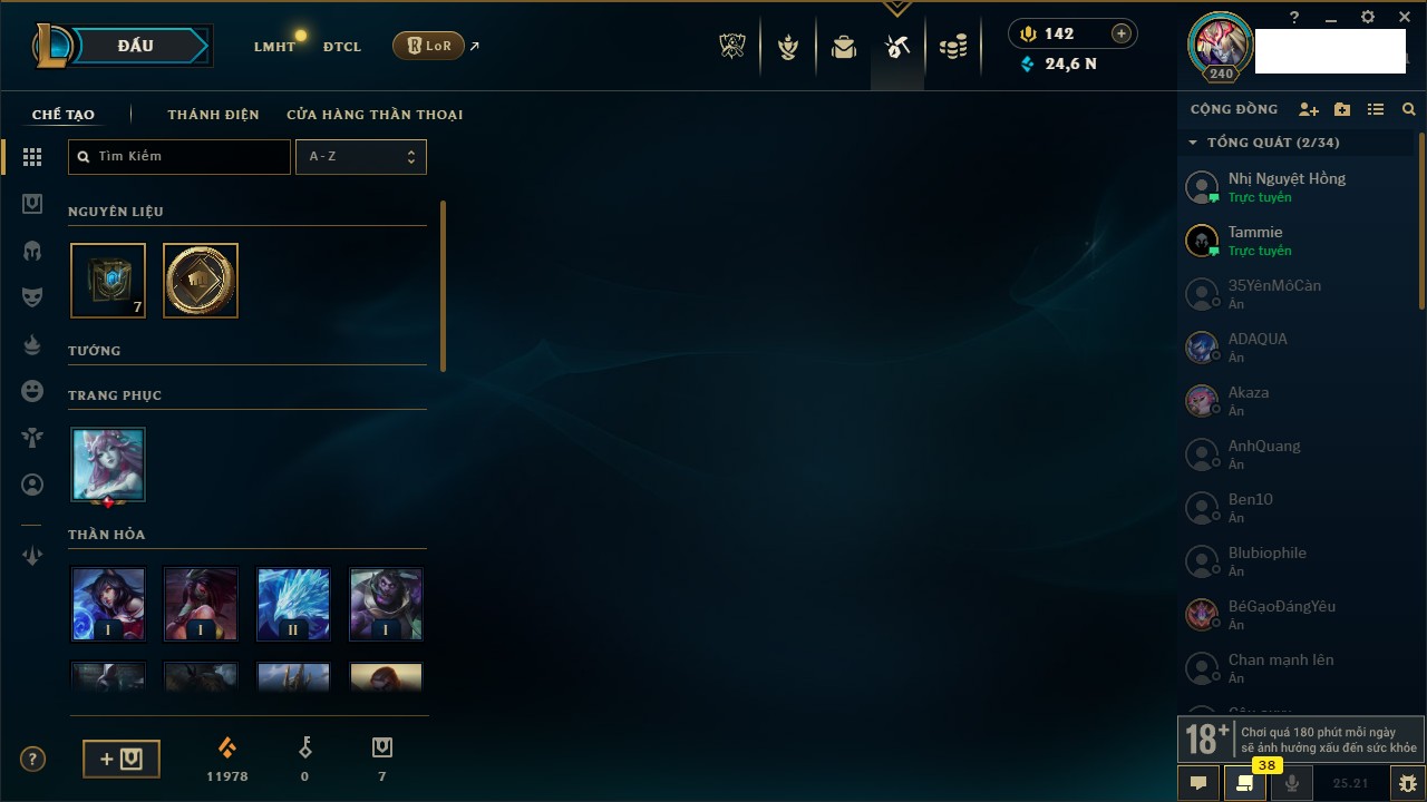 Rank Đơn: Lục Bảo IVKhung: VàngTướng: 171 - Còn 154648 THXTrang Phục: 203Rank ĐTCL: Bạch Kim IVLinh Thú: 69