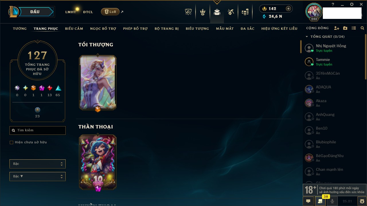 Rank Đơn: Vàng IIIKhung: VàngTướng: 172 - Còn 164704 THXTrang Phục: 255Rank ĐTCL: Kim Cương IVLinh Thú: 156