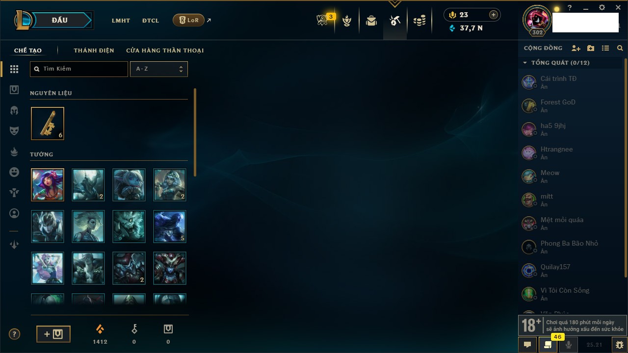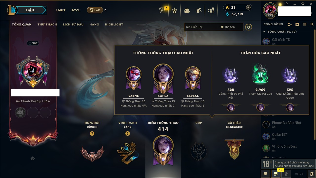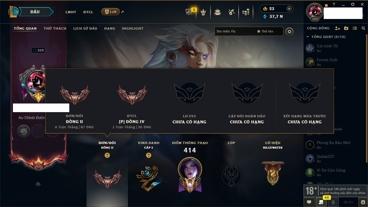 Rank Đơn: Vàng IKhung: BạcTướng: 171 - Còn 60584 THXTrang Phục: 286Rank ĐTCL: Vàng IIILinh Thú: 117