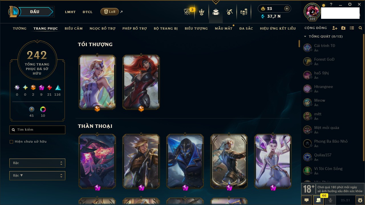 Rank Đơn: Vàng IIIKhung: VàngTướng: 171 - Còn 88128 THXTrang Phục: 329Rank ĐTCL: Chưa RankLinh Thú: 41