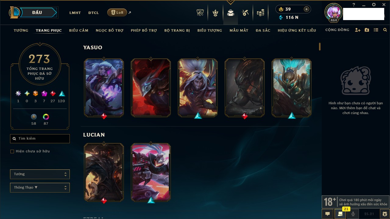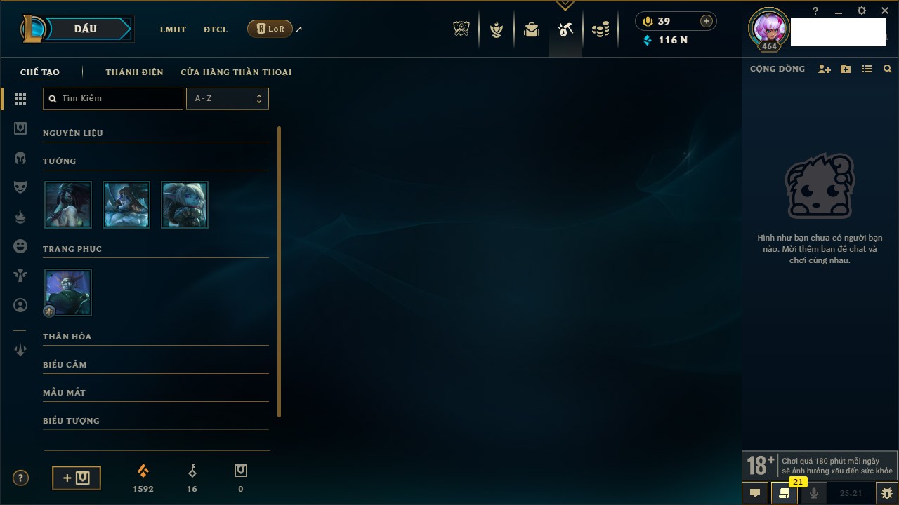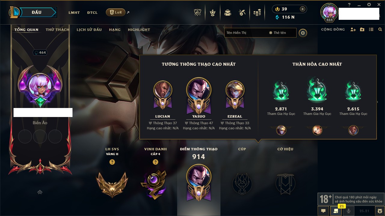 Rank Đơn: Chưa rank mùa nào Khung: Chưa có khung Tướng: 35 - Còn 21851 THX Trang Phục: 3 Rank ĐTCL: Bạch Kim IV Linh Thú: 144