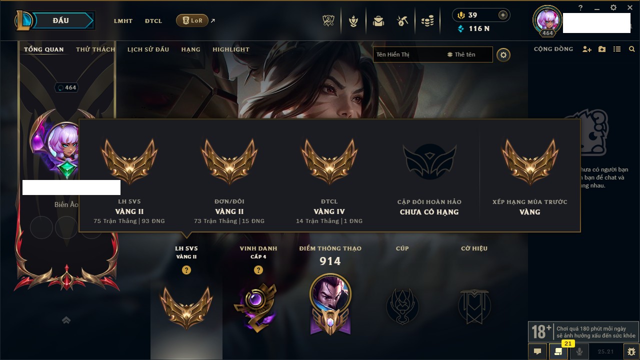Rank Đơn: Vàng II Khung: Vàng Tướng: 171 - Còn 116893 THX Trang Phục: 273 Rank ĐTCL: Vàng IV Linh Thú: 172