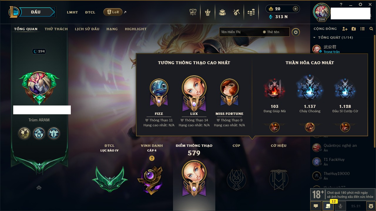 Rank Đơn: Đồng IKhung: ĐồngTướng: 168 - Còn 11447 THXTrang Phục: 245Rank ĐTCL: Chưa RankLinh Thú: 53