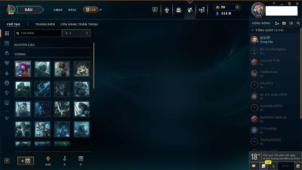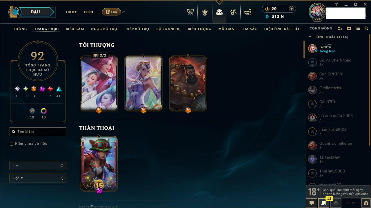 Rank Đơn: Vàng IIIKhung: BạcTướng: 171 - Còn 101359 THXTrang Phục: 88Rank ĐTCL: Kim Cương IVLinh Thú: 200