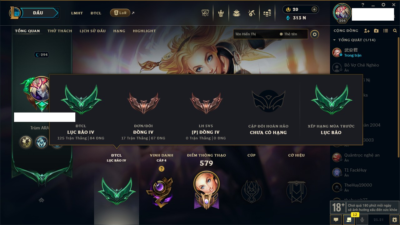 Rank Đơn: Lục Bảo IVKhung: Bạch kimTướng: 171 - Còn 128452 THXTrang Phục: 193Rank ĐTCL: Bạc IIILinh Thú: 100