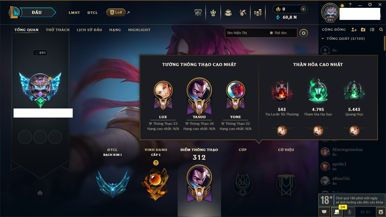 Rank Đơn: Bạch Kim IVKhung: VàngTướng: 171 - Còn 130578 THXTrang Phục: 253Rank ĐTCL: Chưa RankLinh Thú: 20