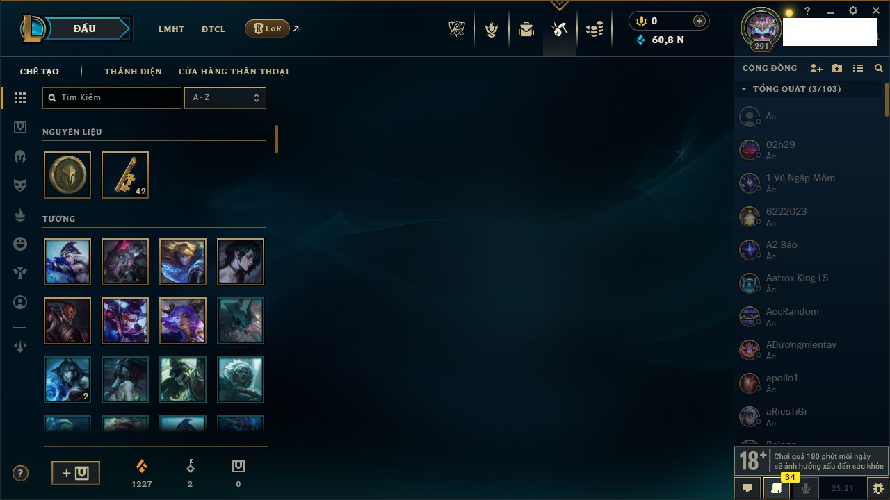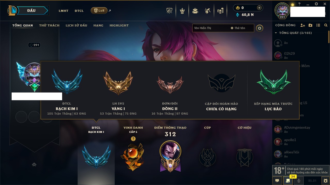 Rank Đơn: Bạch Kim IVKhung: VàngTướng: 171 - Còn 130280 THXTrang Phục: 226Rank ĐTCL: Kim Cương IVLinh Thú: 183
