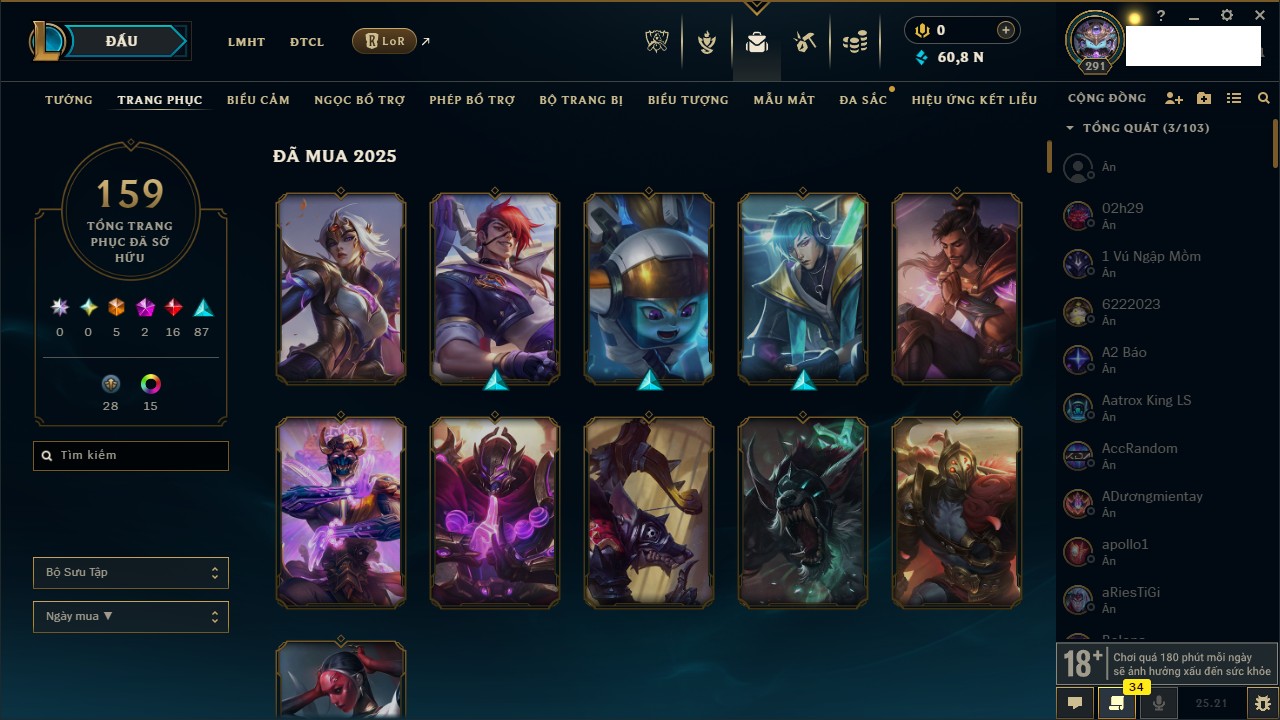 Rank Đơn: Vàng IIKhung: VàngTướng: 171 - Còn 219803 THXTrang Phục: 254Rank ĐTCL: Chưa RankLinh Thú: 78