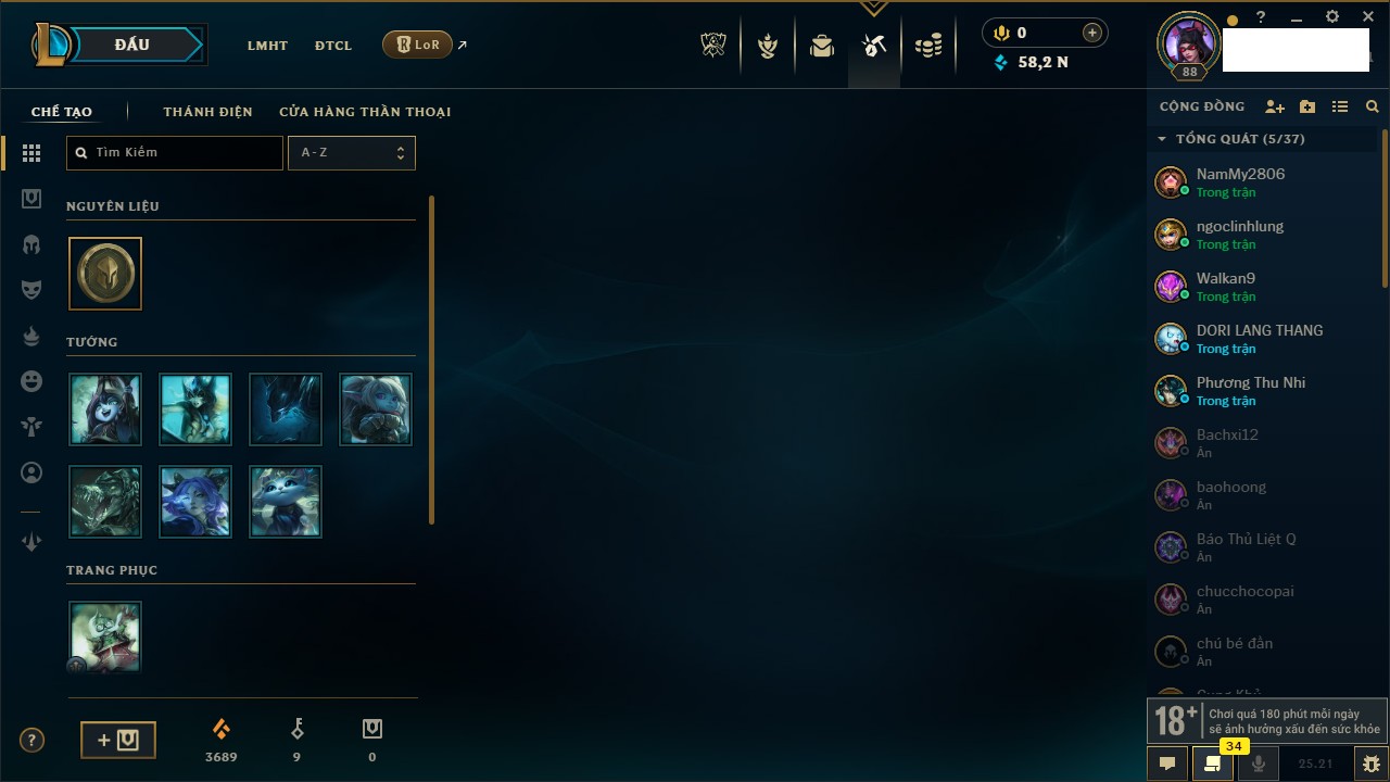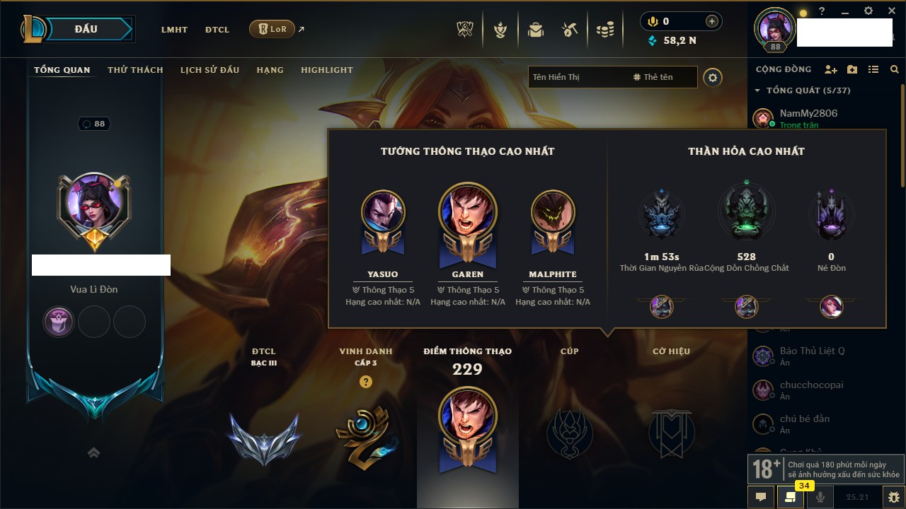 Rank Đơn: Bạch Kim IIKhung: Bạch kimTướng: 171 - Còn 316137 THXTrang Phục: 89Rank ĐTCL: Bạch Kim IIILinh Thú: 94