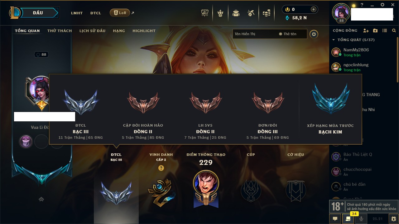 Rank Đơn: Bạch Kim IIKhung: Bạch kimTướng: 171 - Còn 315217 THXTrang Phục: 238Rank ĐTCL: Bạch Kim ILinh Thú: 116