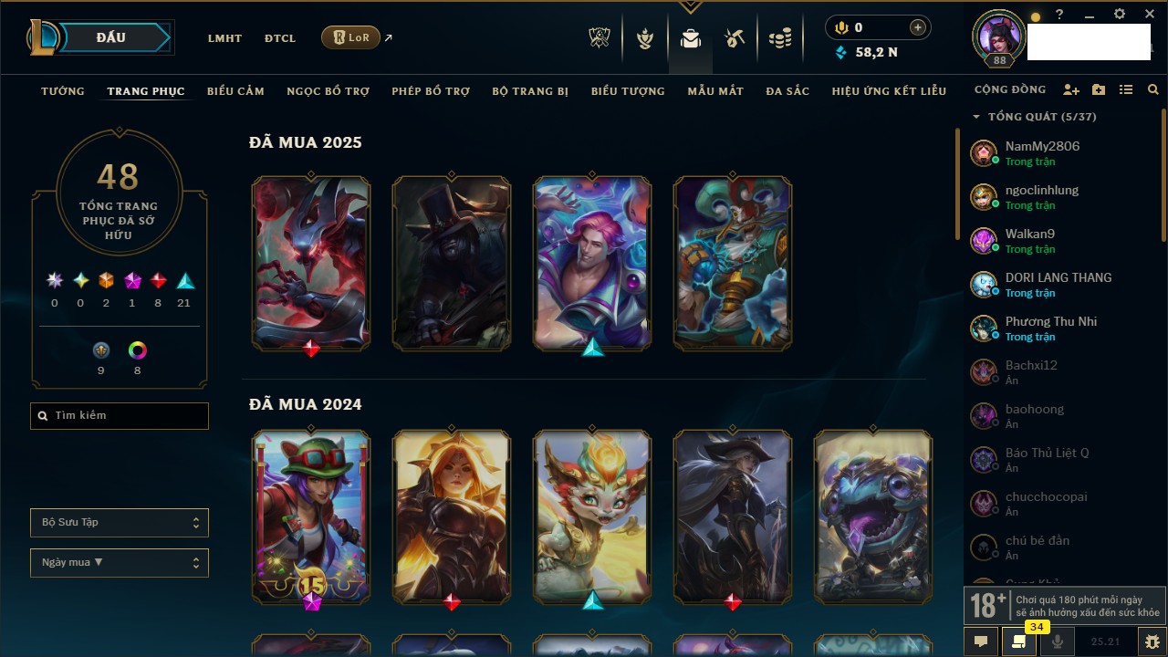 Rank Đơn: Vàng IIKhung: VàngTướng: 170 - Còn 243330 THXTrang Phục: 230Rank ĐTCL: Chưa RankLinh Thú: 68