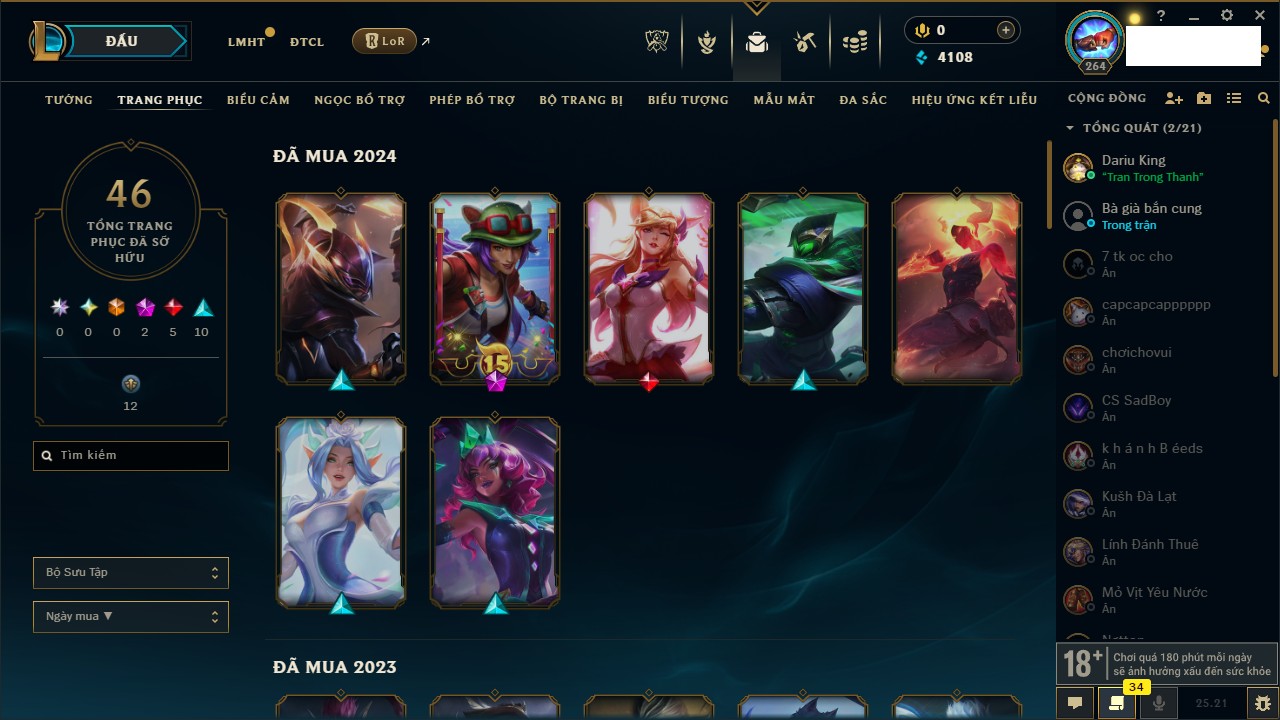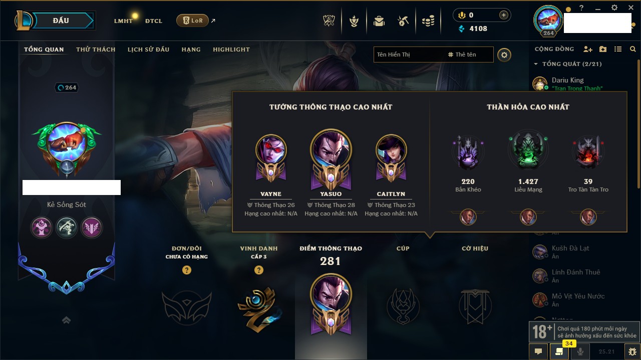 Rank Đơn: Vàng IVKhung: VàngTướng: 171 - Còn 48721 THXTrang Phục: 171Rank ĐTCL: Chưa RankLinh Thú: 27