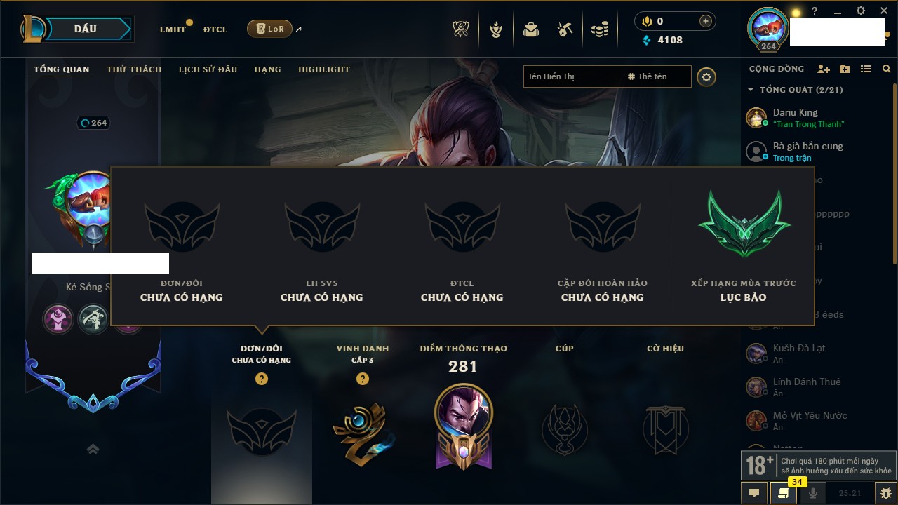 Rank Đơn: Bạc IIKhung: VàngTướng: 171 - Còn 332462 THXTrang Phục: 165Rank ĐTCL: Kim Cương IVLinh Thú: 181