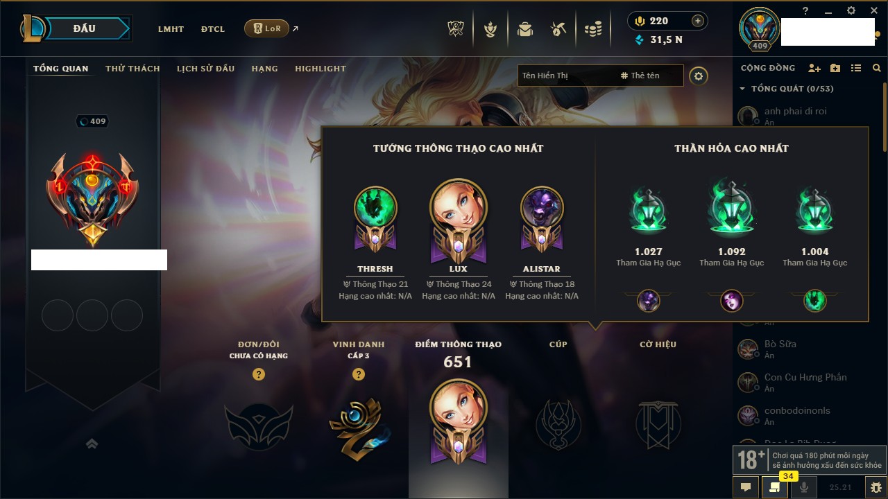 Rank Đơn: Vàng IKhung: BạcTướng: 171 - Còn 60584 THXTrang Phục: 286Rank ĐTCL: Vàng IIILinh Thú: 117