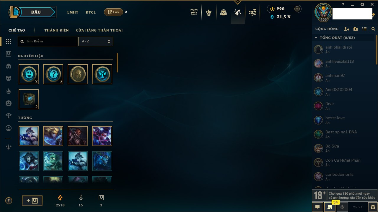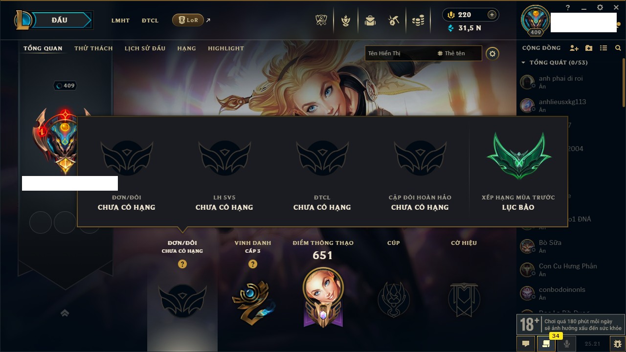 Rank Đơn: Bạch Kim IIIKhung: Bạch kimTướng: 171 - Còn 251383 THXTrang Phục: 229Rank ĐTCL: Sắt IILinh Thú: 51