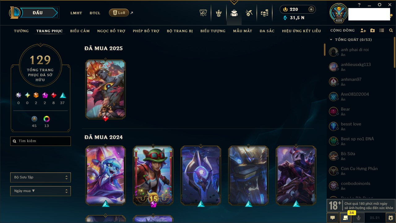 Rank Đơn: Vàng IIIKhung: VàngTướng: 171 - Còn 88128 THXTrang Phục: 329Rank ĐTCL: Chưa RankLinh Thú: 41