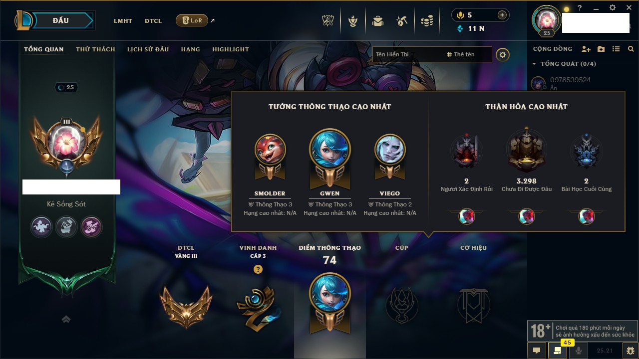 Rank Đơn: Bạch Kim IIIKhung: Bạch kimTướng: 171 - Còn 136108 THXTrang Phục: 261Rank ĐTCL: Bạc IVLinh Thú: 73