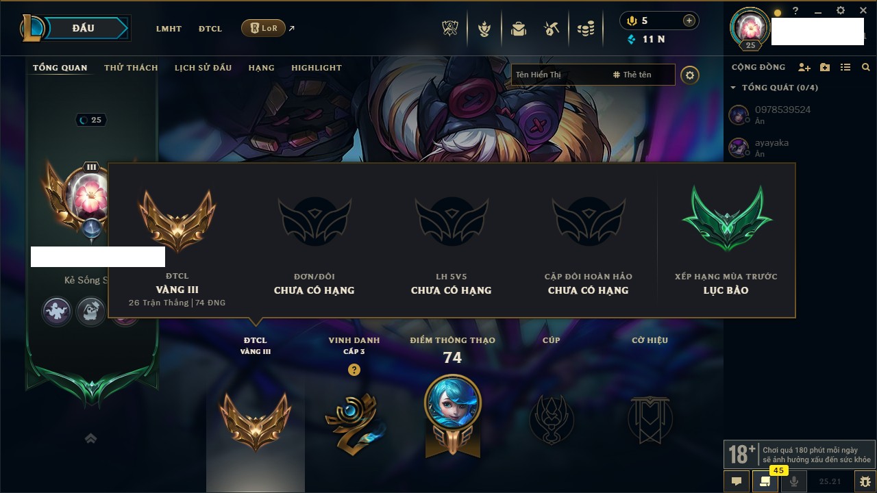 Rank Đơn: Vàng IIIKhung: VàngTướng: 172 - Còn 164704 THXTrang Phục: 255Rank ĐTCL: Kim Cương IVLinh Thú: 156