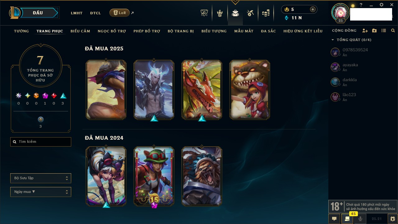 Rank Đơn: Vàng IIKhung: VàngTướng: 170 - Còn 243330 THXTrang Phục: 230Rank ĐTCL: Chưa RankLinh Thú: 68