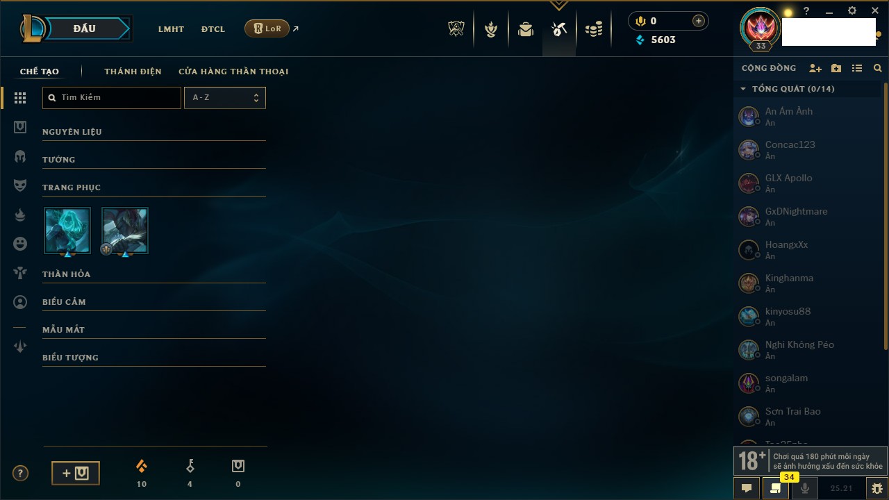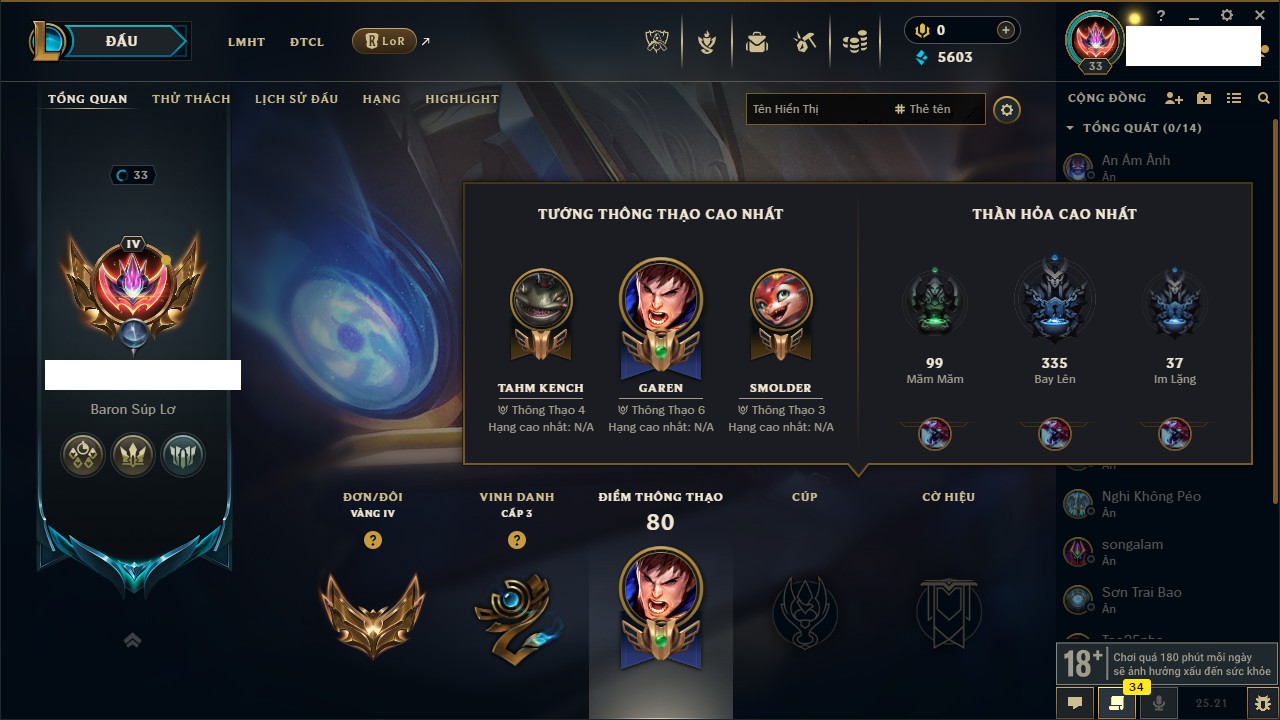 Rank Đơn: Vàng IIIKhung: Bạch kimTướng: 171 - Còn 98230 THXTrang Phục: 235Rank ĐTCL: Vàng IVLinh Thú: 59