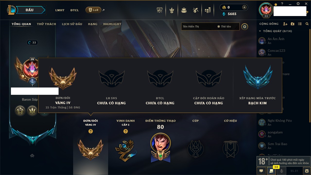 Rank Đơn: Bạch Kim IVKhung: VàngTướng: 171 - Còn 130280 THXTrang Phục: 226Rank ĐTCL: Kim Cương IVLinh Thú: 183